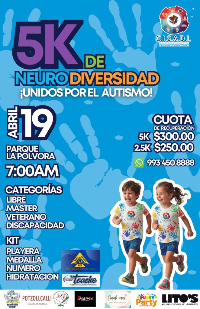 El Centro de Integración Sensorial de Aprendizaje y Desarrollo Infantil (C.I.S.A.D.I.) presentó este viernes la primera carrera de NeuroDiversidad “¡Unidos por el Autismo!”, programada para el domingo 19 de abril en el parque ‘La Pólvora’, en Villahermosa a las 7:00 horas.
