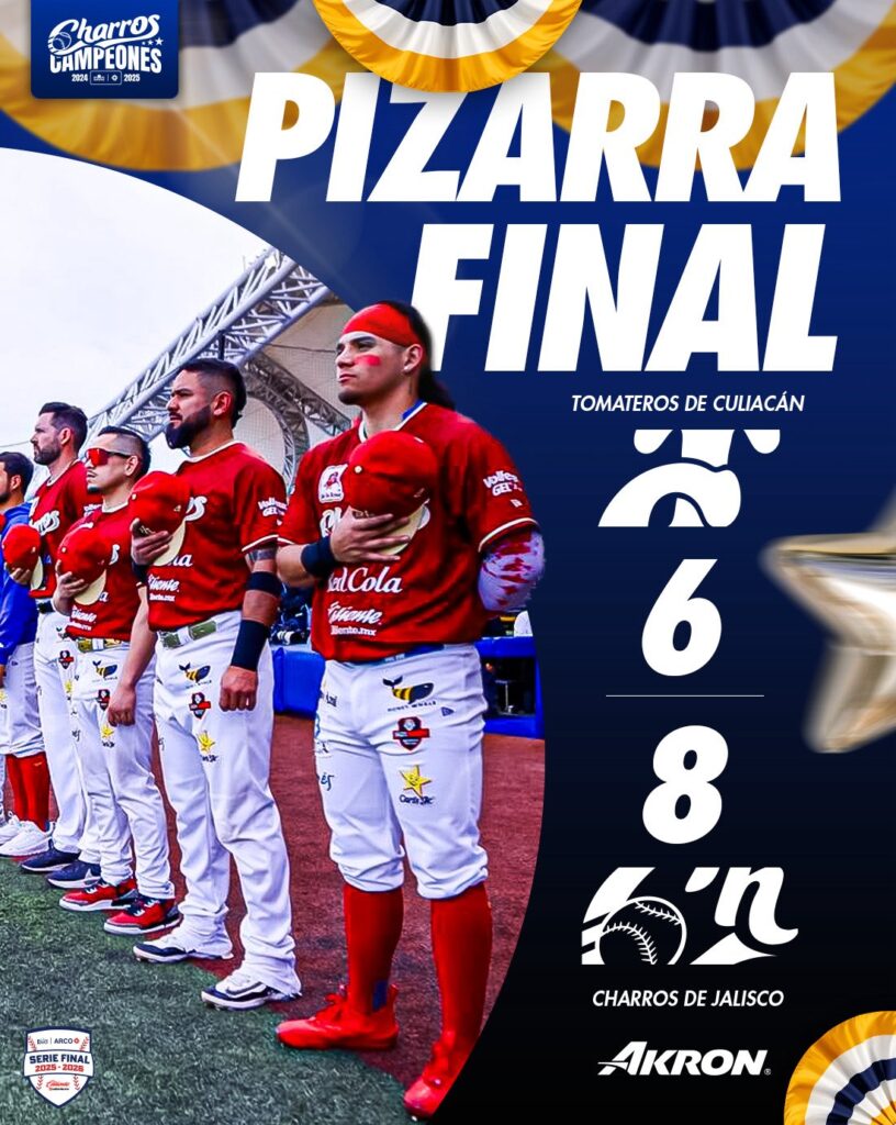 Los Charros de Jalisco se proclamaron bicampeones en la Liga del Pacífico de Beisbol y lo hicieron con barrida de por medio al vencer a los Tomateros de Culiacán en cuatro juegos. Este domingo ante un lleno en el Estadio Panamericano, y excelente ambiente, se impusieron 8 carreras por 6, para provocar una gran celebración ante los aficionados.