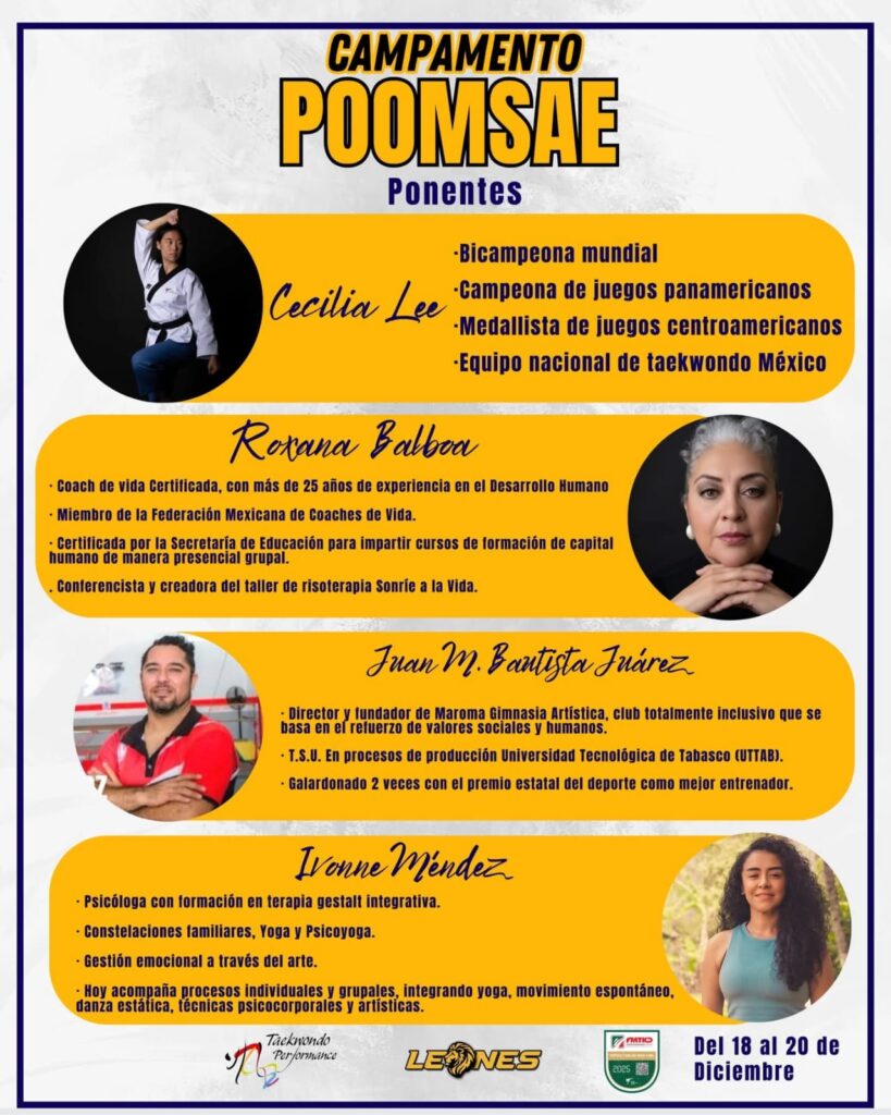 Con la finalidad de brindar a los atletas practicantes del deporte marcial de origen coreano una experiencia formativa única, la organización Taekwondo Performance Leones que preside el profesor Leonardo Guzmán, anunció el Campamento Poomsae Leones, el cual se realizará del 18 al 20 de diciembre en la capital tabasqueña.