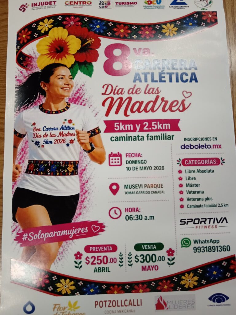 Este martes se anunció la celebración de la 8ª Carrera Atlética del Día de las Madres, que incluirá distancias de 5 y 2.5 kilómetros, así como una caminata familiar. El evento se llevará a cabo el próximo 10 de mayo en el Musevi – Parque Tomás Garrido Canabal en Villahermosa.