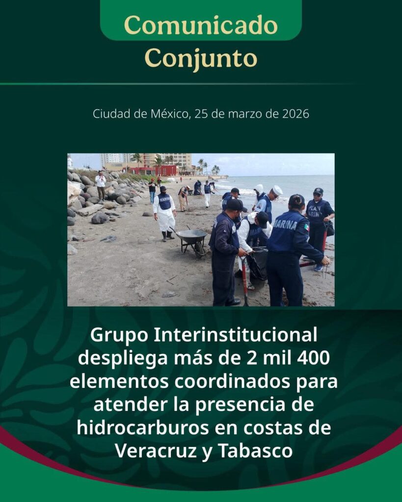 El Grupo Interinstitucional integrado por la Secretaría de Marina (Semar), la Secretaría de Medio Ambiente y Recursos Naturales (Semarnat), la Secretaría de Energía (Sener), la Agencia de Seguridad, Energía y Ambiente (ASEA), Petróleos Mexicanos (Pemex), la Procuraduría Federal de Protección al Ambiente (Profepa) y autoridades estatales y locales informa que se ha desplegado un estado de fuerza de más de 2 mil 450 elementos para atender la presencia de hidrocarburos detectada en zonas costeras de Veracruz y Tabasco, desde el 3 de marzo.