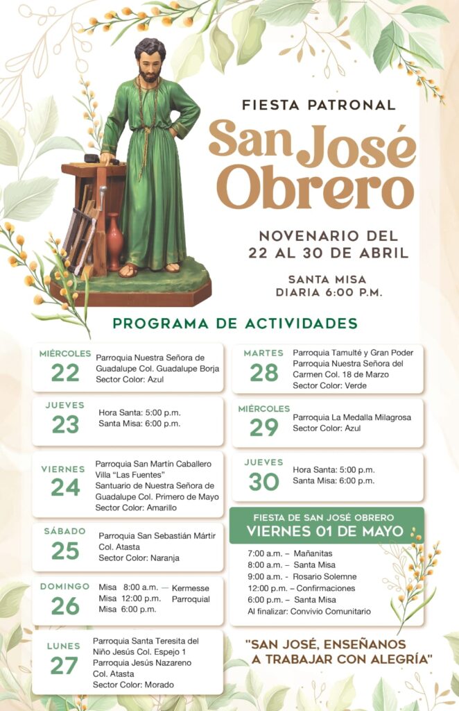 Para el 01 de mayo, fiesta a San José Obrero, el día inicia con las tradicionales mañanitas a las 7 am, seguido de la misa a las 8 am, para las 9 am se realizará el rosario solemne, a las 12 pm misa de confirmación, a las 6 de la tarde misa de clausura y al termino habrá un convivio comunitario.