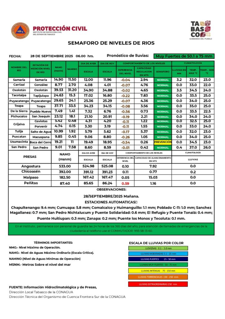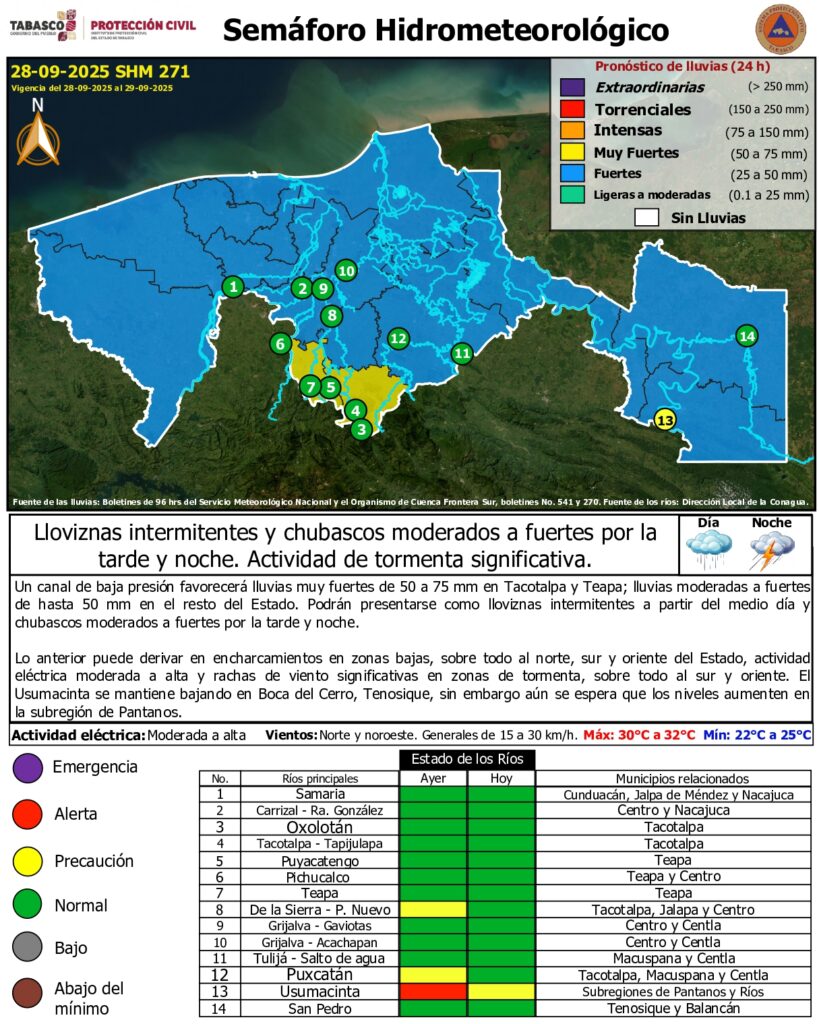 Lo anterior puede derivar en encharcamientos en zonas bajas, sobre todo al norte, sur y oriente del Estado, actividad eléctrica moderada a alta y rachas de viento significativas en zonas de tormenta, sobre todo al sur y oriente. El Usumacinta se mantiene bajando en Boca del Cerro, Tenosique, sin embargo aún se espera que los niveles aumenten en la subregión de Pantanos.