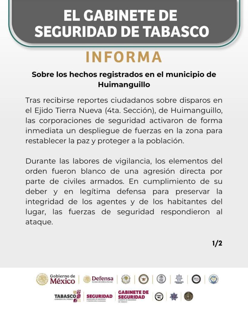 La madrugada de este lunes se registró un enfrentamiento armado en la ranchería Tierra Nueva 4ta Sección, en Huimanguillo, luego de que corporaciones de seguridad acudieran a la zona tras reportes ciudadanos de detonaciones de arma de fuego.