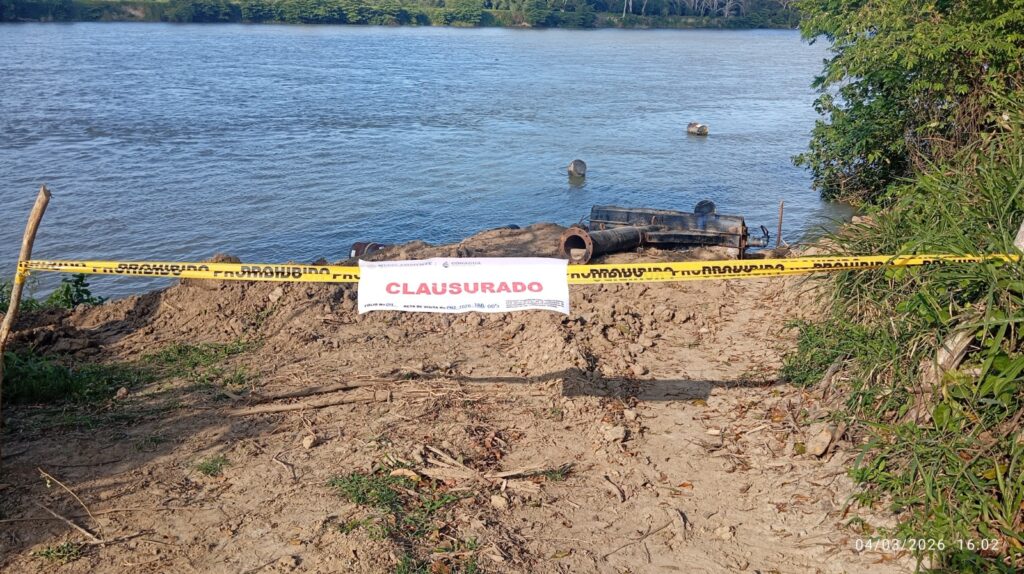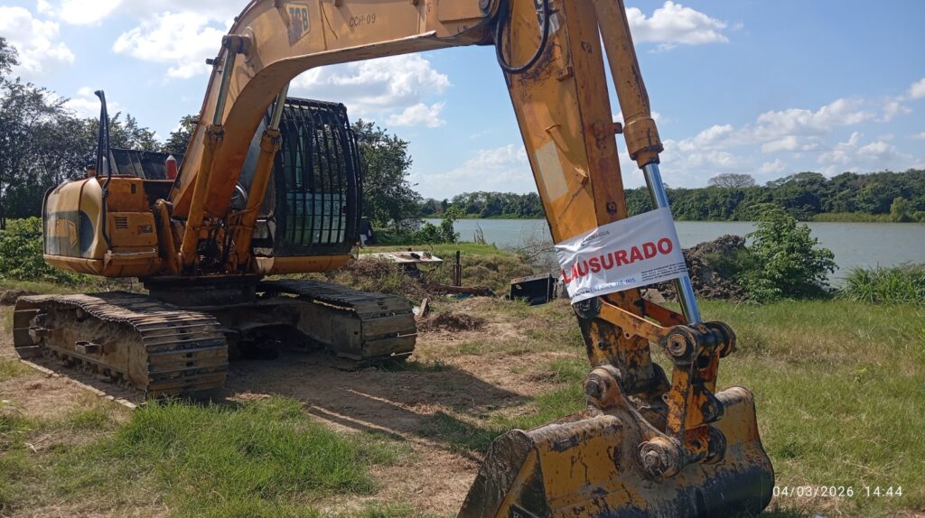En el sitio se encontraron dos excavadoras de carga y una rampa de acceso construida tras la remoción del barrote natural del cauce. Para garantizar el cese de la actividad, se impusieron sellos de clausura en la rampa de acceso al cauce, la línea de descarga de la draga de succión y los brazos mecánicos de las excavadoras.