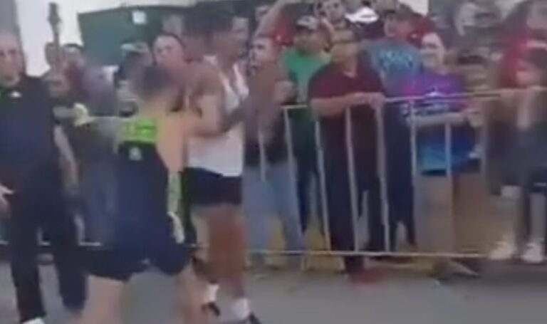 En la imagen se alcanza a ver cómo Casillas llega a la meta celebrando incluso con la gente su triunfo y en medio de la celebración Balam lo golpea.