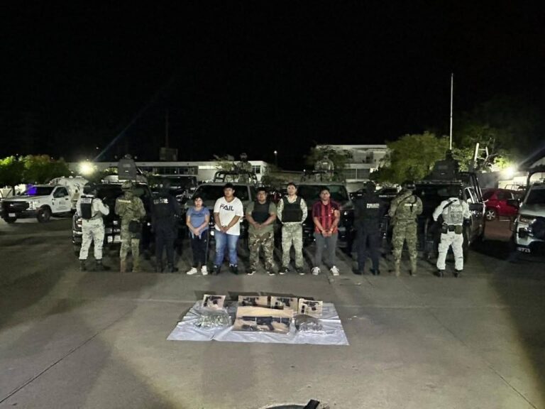 Las autoridades informaron que durante los patrullajes de prevención del delito realizados en la ciudad de Frontera, se logró la identificación de cuatro hombres y una mujer, quienes portaban 4 sub-ametralladoras conocidas como ‘mini Uzi’, un arma larga, cartuchos útiles y dos bolsas con hierba color verde con características similares a marihuana.