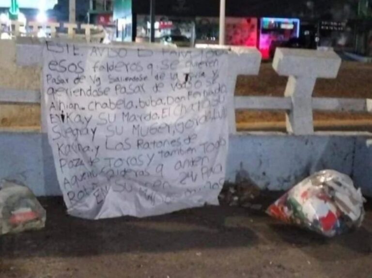 Los detenidos Guillermo Mauricio “N”, con domicilio en la Col. 18 de Marzo; Alejandro “N” de la Col. Indeco y Erick Francisco “N” (a) El Beni y/o Ronaldo y/o Catracho y/o Venezuela, originario de Venezuela y con domicilio en la Col. Indeco, declararon que el pasado martes alrededor de las 21:59 horas colocaron la mencionada manta con amenazas en la infraestructura pública por ordenes de otros sujetos que ya son investigados.