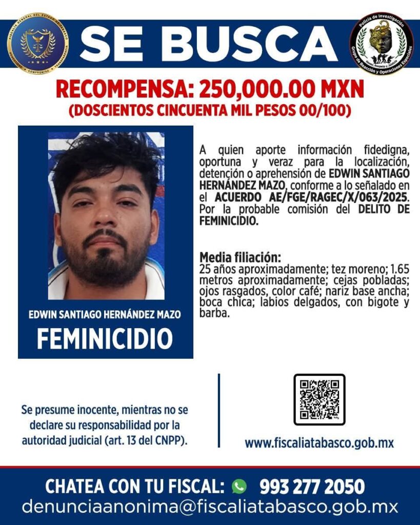 La Fiscalía General del Estado de Tabasco había ofrecido una recompensa de 250 mil pesos para dar con su paradero, luego de que fuera señalado como principal sospechoso del crimen que conmocionó a aquel municipio.
