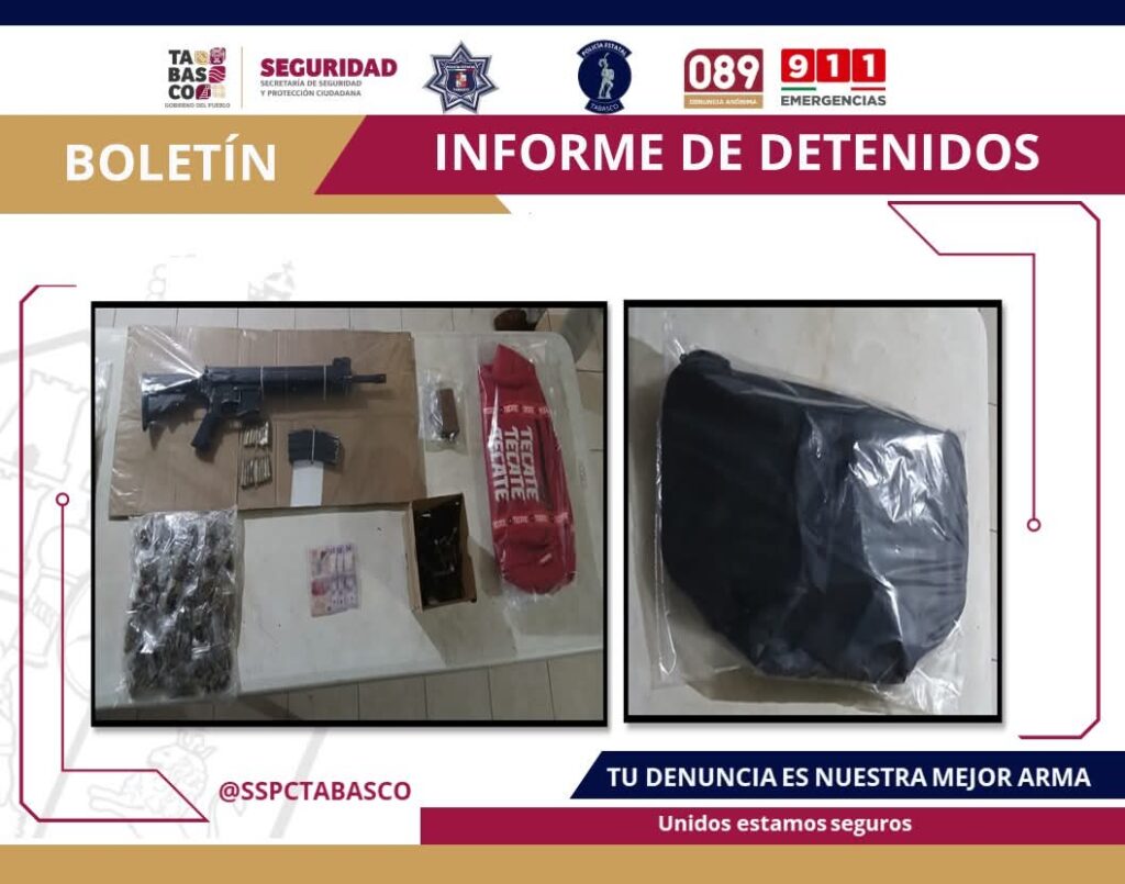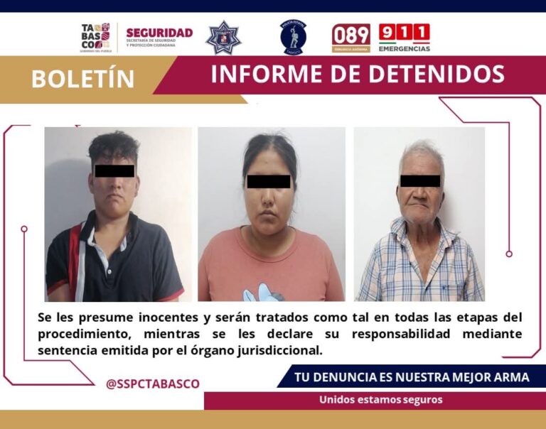 Las detenciones se llevaron a cabo durante recorridos preventivos en la ranchería Medellín y Madero, en la segunda sección del municipio de Centro. Los arrestados son Ernesto “N”, alias “el Maco”, de 74 años; Wilbert “N”, alias “el Gordo”, de 18 años; y María Guadalupe “N”, de 20 años.