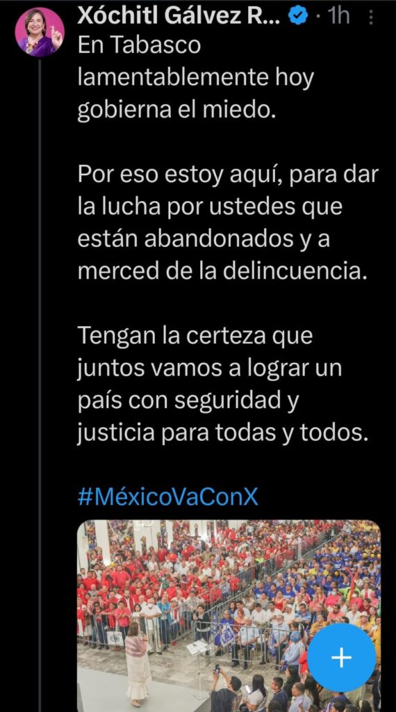 La precandidata a la presidencia de la República por el PRI-PRD señaló esta noche en su cuenta de red social C que “en Tabasco, lamentablemente hoy gobierna el miedo “.