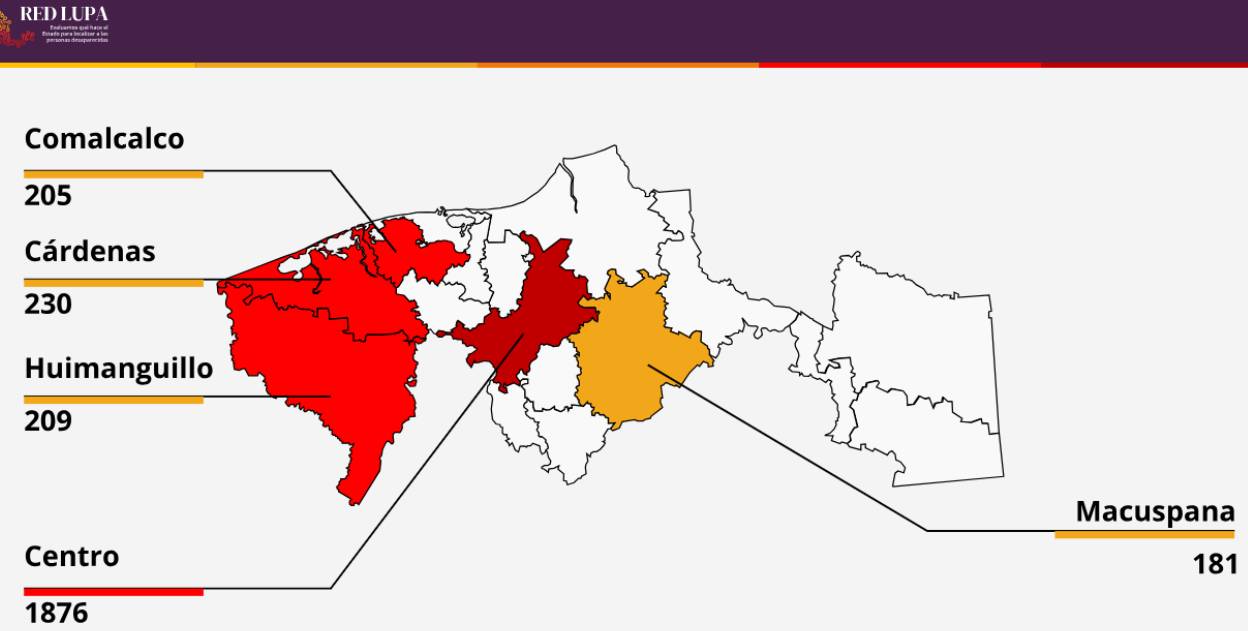 En este 2025, los casos de desapariciones los encabeza Centro, de acuerdo con los datos del Instituto Mexicano de Derechos Humanos y Democracia (IMDHD). Las cifras que muestra en su página son al corte de mayo.