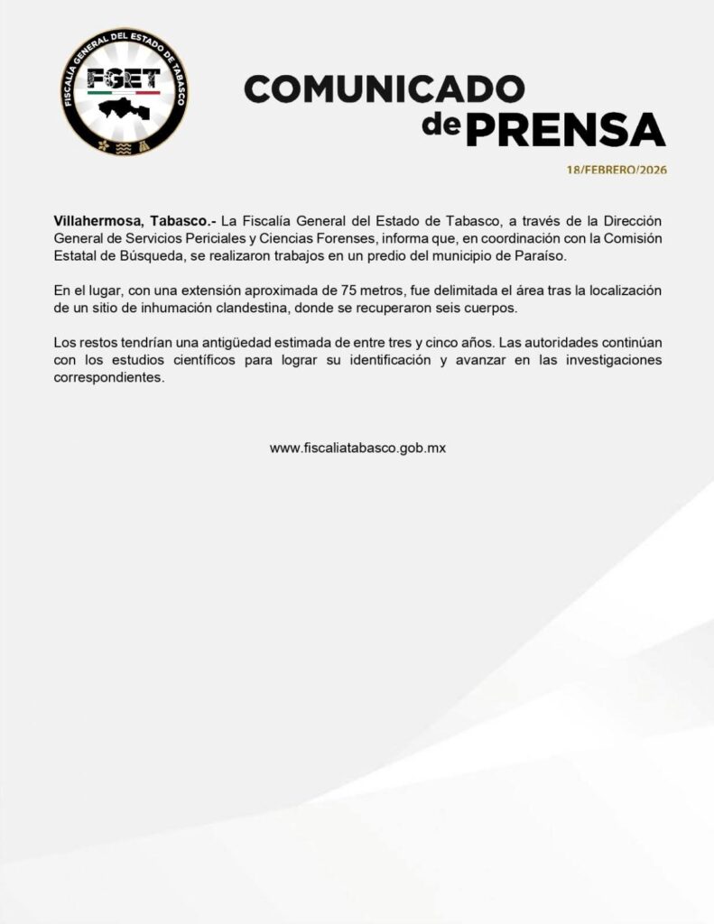 Seis cuerpos fueron localizados este miércoles en una fosa clandestina en el municipio de Paraíso, desatando consternación y temor entre los habitantes de la zona.