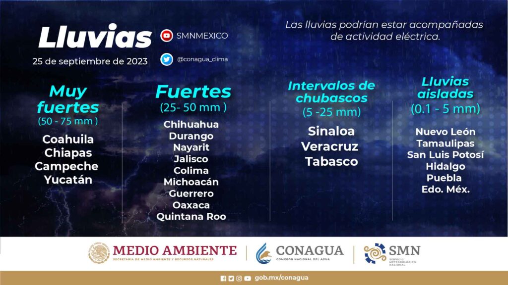 Lo primero que debes saber es que se espera que continúen los canales de baja presión sobre el interior del país, así como el frente frio número 3 al norte de la República Mexicana y el ingreso de humedad de ambos litorales, que originarán lluvias muy fuertes en Campeche, Chiapas, Coahuila y Yucatán; fuertes en Chihuahua, Colima, Durango, Guerrero, Jalisco, Michoacán, Nayarit, Oaxaca y Quintana Roo; intervalos de chubascos en Sinaloa, Tabasco y Veracruz, y aisladas en Estado de México, Hidalgo, Nuevo León, Puebla, San Luis Potosí y Tamaulipas.