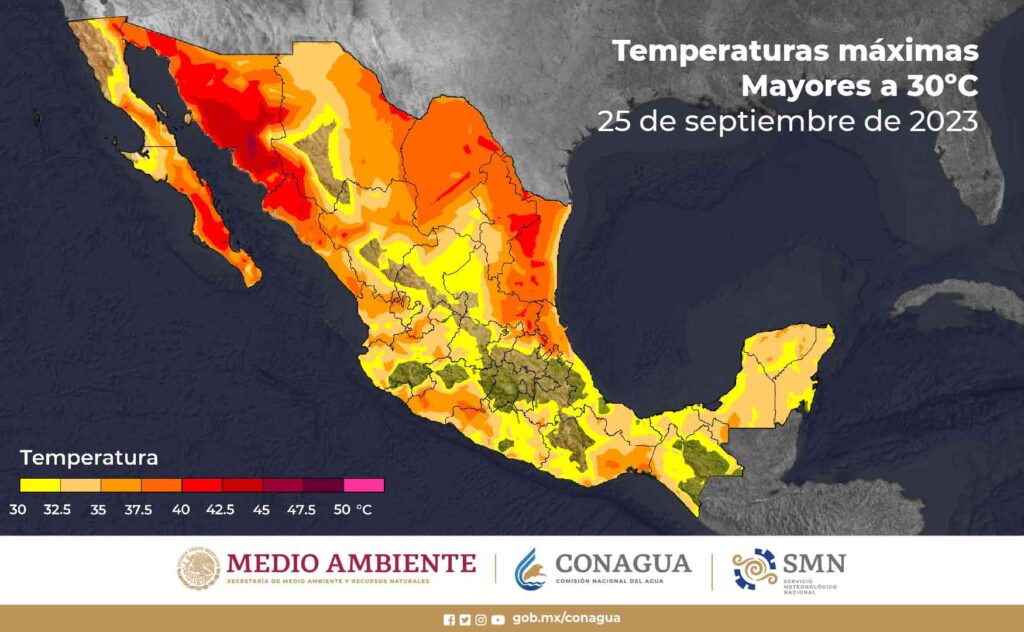 Así como, temperaturas de 35 a 40 grados en Baja California, Campeche, Chiapas, Coahuila, Colima, Durango, Guerrero, Jalisco, Michoacán, Nayarit, Nuevo León, Oaxaca, Quintana Roo, San Luis Potosí, Tabasco, Tamaulipas, Veracruz y Yucatán; y de 30 a 35 grados Celsius en Aguascalientes, Guanajuato, Hidalgo, Morelos, el norte y suroeste de Puebla, Querétaro y Zacatecas.