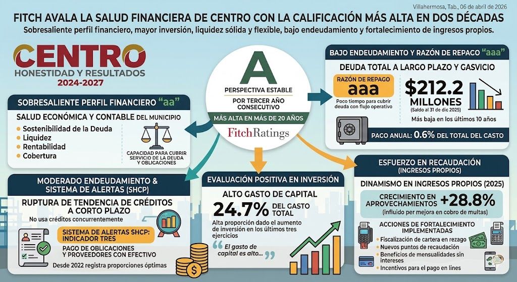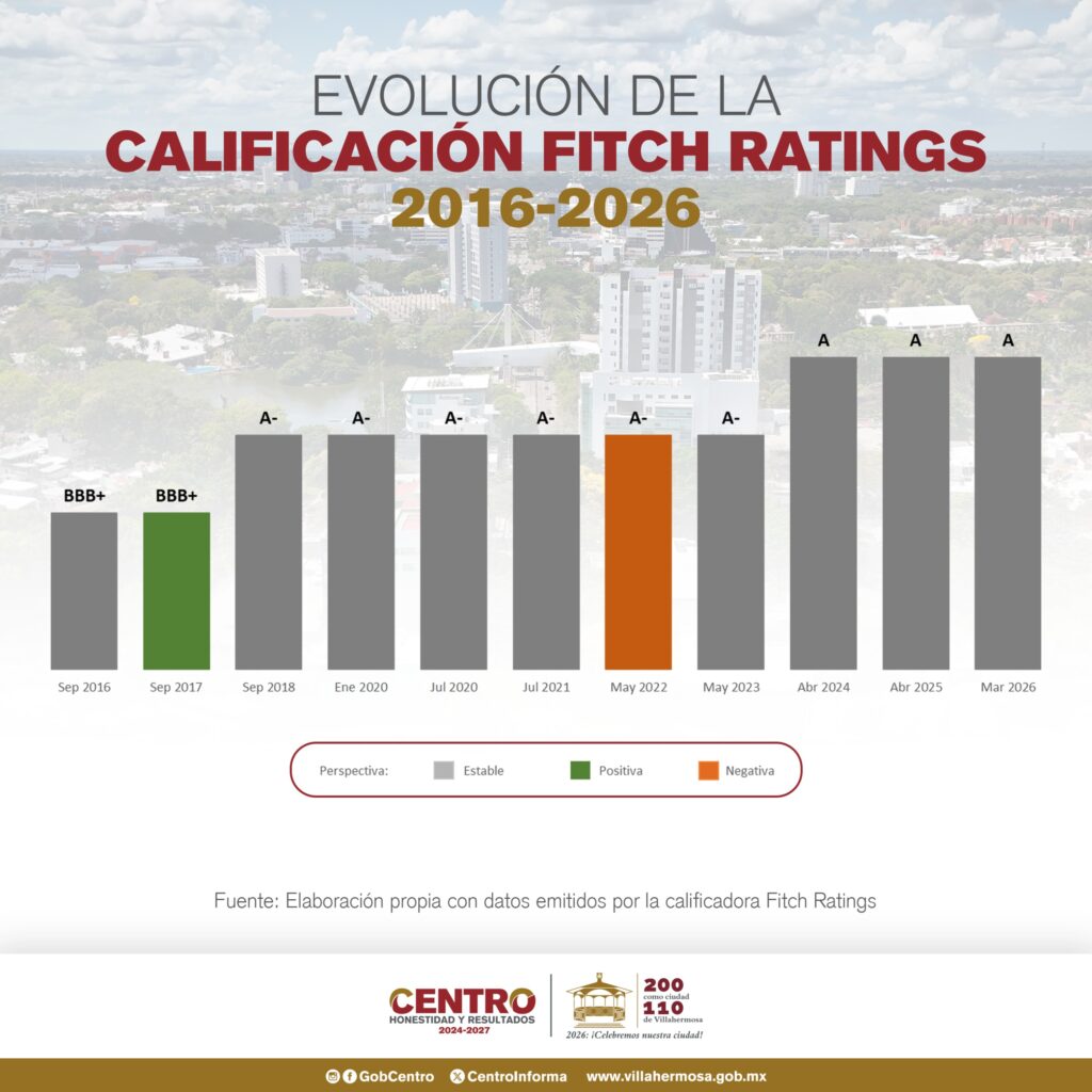 Por tercer año consecutivo la agencia calificadora de riesgo Fitch Ratings otorgó a Centro en este año la calificación de “A” con perspectiva estable, la más alta desde hace más de 20 años. Además, calificó de forma sobresaliente con “aa” la salud económica contable y económica del municipio.