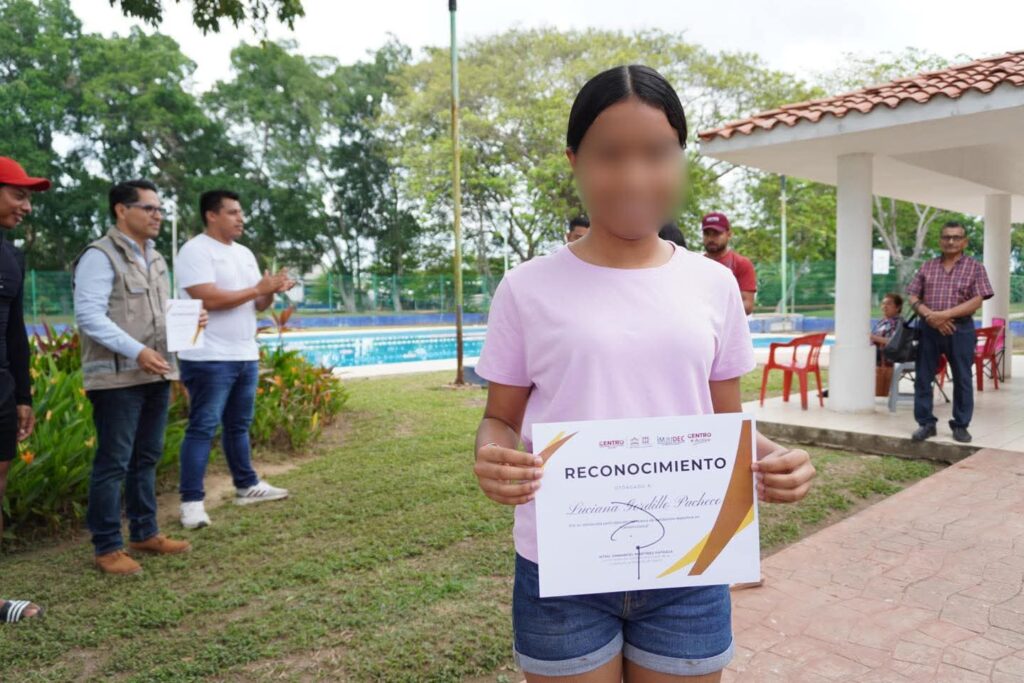 Finalmente, la edil visitó la alberca municipal, donde presenció una clase de exhibición de niñas y niños que demostraron su avance en las técnicas de natación, a quienes obsequió el cuento “El hombre que anhelaba trabajar en un circo”, de Bruno Estañol.