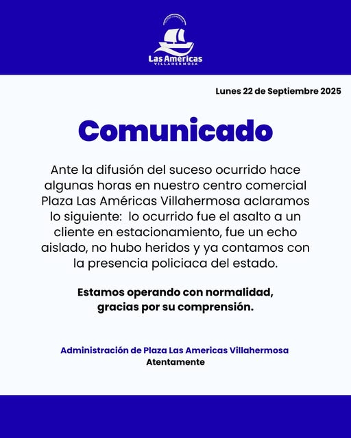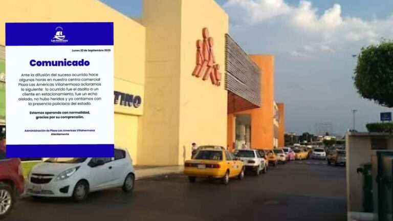 Este lunes 22 de septiembre de 2025 ocurrió una movilización policiaca en Plaza Las Américas debido a un asalto, en el centro comercial ubicado en la Avenida Ramón Mendoza de Villahermosa.