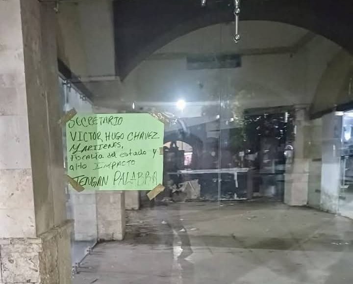 A unos metros del Palacio de Gobierno, fue dejada una cartulina en lo que fuera las instalaciones de una cafetería.