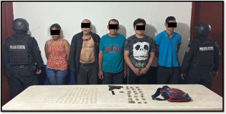Se trata de cinco hombres y una mujer, además de los cuales también se aseguró una motocicleta con reporte de robo, un arma corta, un cargador, nueve cartuchos y 157 dosis de diferentes drogas.
