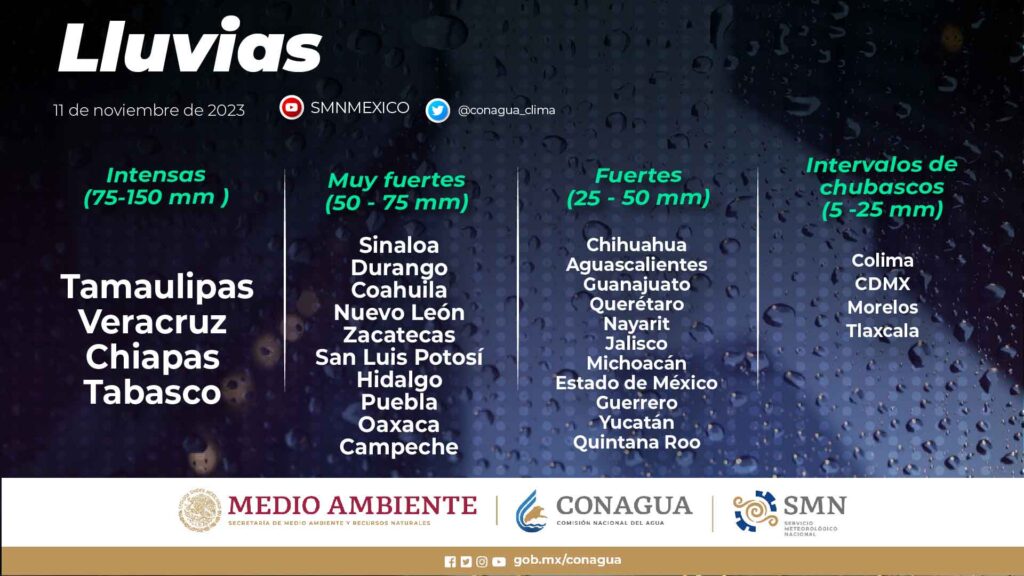 Los aguaceros de mayor intensidad serán con descargas eléctricas y granizadas, y podrían generar deslaves, incremento en niveles de ríos y arroyos, así como desbordamientos e inundaciones en zonas bajas de los estados mencionados, por lo que se exhorta a la población a atender los avisos del Servicio Meteorológico Nacional (SMN), de la Comisión Nacional del Agua (Conagua), y seguir las recomendaciones de Protección Civil.